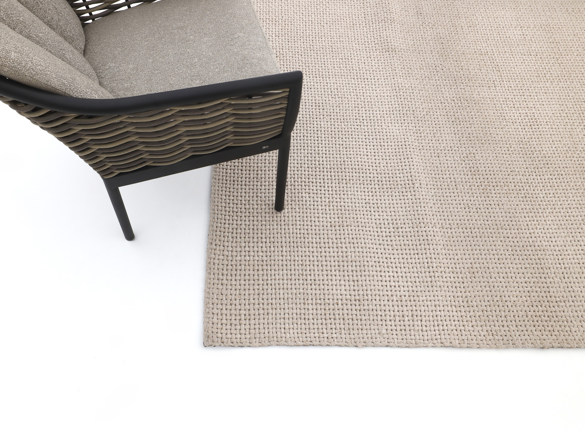 Helles Gartenmöbel-Set auf einem hellen Outdoor Teppich