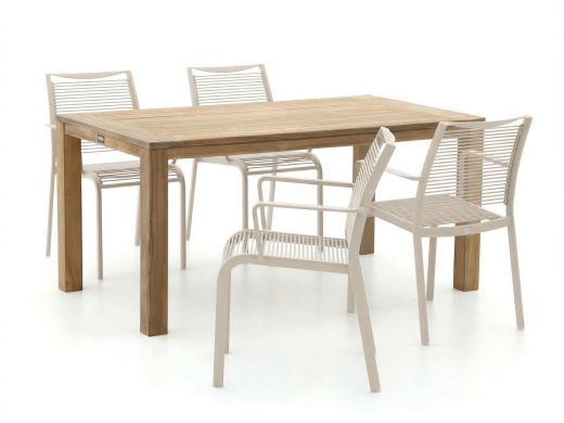 Das Apple Bee Hawaii/ROUGH S Gartenmöbel-Set ist eine gute Wahl, wenn Sie zu viert komfortabel draußen essen möchten und es auf Ihrer Terrasse ruhig und geradlinig mögen. Das Set besteht aus einem ROUGH S Gartentisch aus Teakholz mit 160 cm und 4 stapelbaren Stühlen mit Kunststoffschnur in Camel. Die Teakholz-Tischplatte in old teak greywash verleiht dem Set eine markante, natürliche Optik, an der Sie Ihre Stühle leicht verschieben können. Dank der stapelbaren Stühle ist schnell aufgeräumt, wenn Sie kurzfristig mehr Platz brauchen – zum Beispiel für ein Kinderplanschbecken of een barbecue.