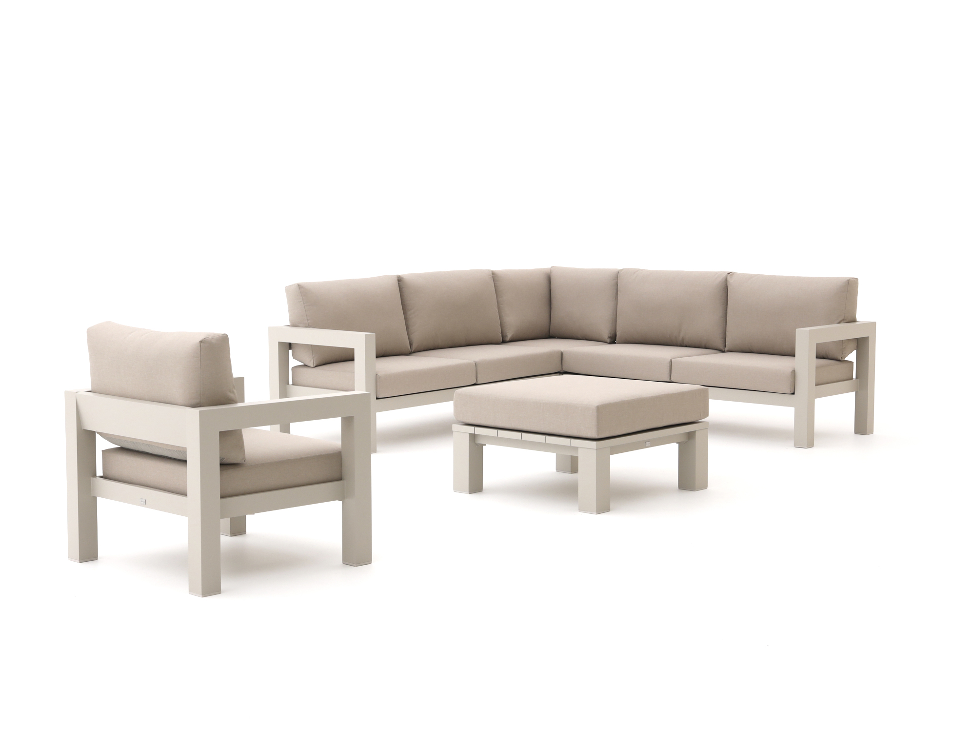 Das Bellagio Campazzo Ecklounge-Set ist ein Lounge-Set aus Aluminium für 6 Personen, inklusive Kissen – ideal, wenn Sie gerne lange und entspannt draußen sitzen. Dank der Eckaufstellung nutzen Sie den Platz in Ihrem Garten oder auf Ihrem Balkon optimal; Sie rücken die Gruppe einfach in die Ecke und gewinnen so mehr Bewegungsfläche. Das Aluminiumgestell ist leicht, wodurch Sie das Set leichter verschieben können, wenn Sie zum Beispiel sauber machen möchten oder kurz in den Schatten rücken wollen. Die taupe-sandfarbenen Kissen schaffen eine ruhige, warme Atmosphäre und laden dazu ein, sich mit einem Buch oder einer Snackplatte entspannt zurückzulehnen. Die Bezüge sind abnehmbar, sodass Sie sie bei kleinen Malheurs einfach zur Reinigung abziehen können – praktisch, wenn Kinder oder Besuch da sind.