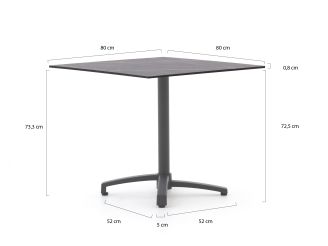 Der Bellagio Canzo Klapptisch 80x80cm ist ein kompakter Gartentisch für alle, die wenig Platz haben, aber trotzdem gern draußen essen oder ein Getränk genießen möchten. Dank des klappbaren Designs lässt sich das grau-anthrazitfarbene Aluminiumgestell im Handumdrehen zusammenklappen. So ist dieser Tisch ideal für den Balkon, eine kleine Terrasse oder als zusätzlicher Beistelltisch. Die quadratische HPL-Kunststoff-Tischplatte (in einem dunklen Grauton) ist robust und pflegeleicht. Sie können also problemlos Teller, Gläser und eine Schale mit Snacks darauf abstellen, ohne sich Gedanken machen zu müssen. Mit seinem Maß von 80x80 cm bietet der Tisch ausreichend Platz für 2 bis 4 Personen, ohne dass Ihre ganze Terrasse sofort vollgestellt ist.