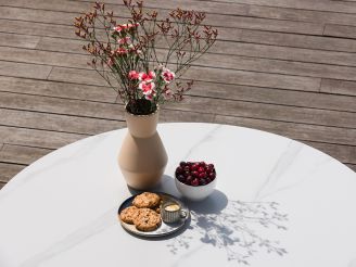 Der Bellagio Lodola Gartentisch ist ein runder Gartentisch für 4 Personen – ideal, wenn Sie gerne draußen essen oder in gemütlicher Runde etwas trinken. Die weiße Sintered-Stone-Tischplatte ist robust und kratzfest, so können Sie Teller, Töpfe und Schalen ganz entspannt abstellen. Das beige Aluminiumgestell ist leicht und rostet nicht, sodass Sie den Tisch mühelos verschieben können, wenn Sie Ihre Terrasse anders gestalten möchten. Mit einem Durchmesser von 130 cm bietet er genügend Platz für vier Stühle, ohne die ganze Terrasse einzunehmen. Stellen Sie den Tisch am besten auf einen ebenen Untergrund, dann steht er besonders stabil und wackelnde Weingläser gehören der Vergangenheit an.