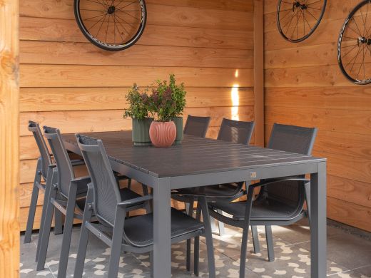 Ein solides Gartenmöbel-Set mit einem rechteckigen Gartentisch und sechs stapelbaren Gartenstuhl. Die Platte des Tisches ist aus Polywood im Grey Oak-Look, sodass sie wie Holz wirkt, aber wasser- und schmutzabweisend ist. Die Gestelle sind aus Aluminium, das nicht rostet und stabil bleibt, und die Sitzflächen aus Textilene passen sich angenehm dem Körper an. Stabile Materialien und die stapelbaren Stühle machen das Set praktisch für den täglichen Gebrauch im Freien.