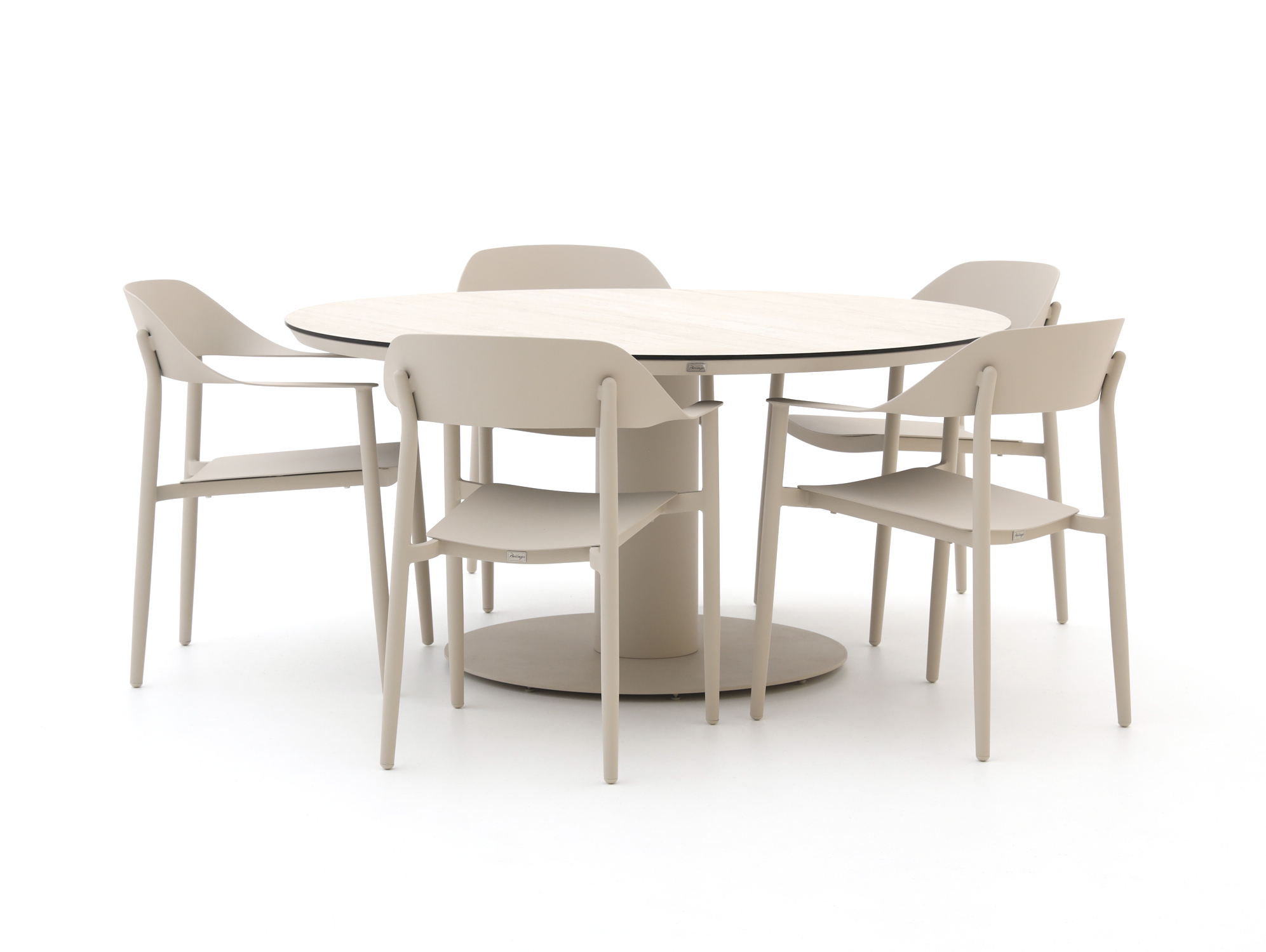 Das runde Bellagio Valli/La Fonte Gartenmöbel-Set ist ideal, wenn Sie mit der Familie oder einer kleinen Runde Freunde draußen essen und etwas trinken möchten. Der runde Tisch mit 150 cm Durchmesser lädt zum Plaudern ein, alle sitzen gleich zentral. Das Aluminium-Stuhlgestell ist leicht, dadurch lassen sich die Stühle einfach verschieben, wenn Sie den Tisch anders stellen möchten. Die Kunststoff-Tischplatte in beiger Steinoptik wirkt ruhig und ist pflegeleicht, so sind Sie schneller fertig und sitzen länger mit dem Teller draußen statt mit dem Tuch in der Hand.