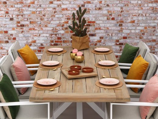 • Tischplatte aus Teakholz: Teakholz ist robust und für draußen gemacht – so hält Ihre Tischplatte einem Regenschauer und intensiver Nutzung stand.