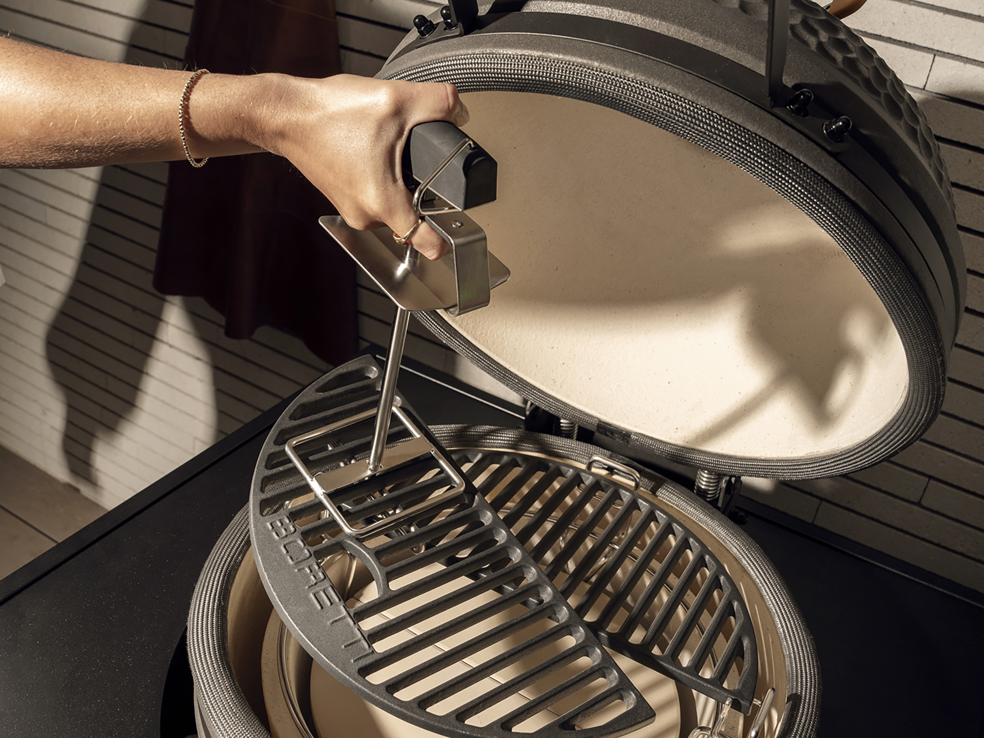 • Dank des stabilen Hakens bleibt der Rost beim Anheben und Versetzen sicher in Position, auch wenn Sie ihn zum Reinigen entfernen