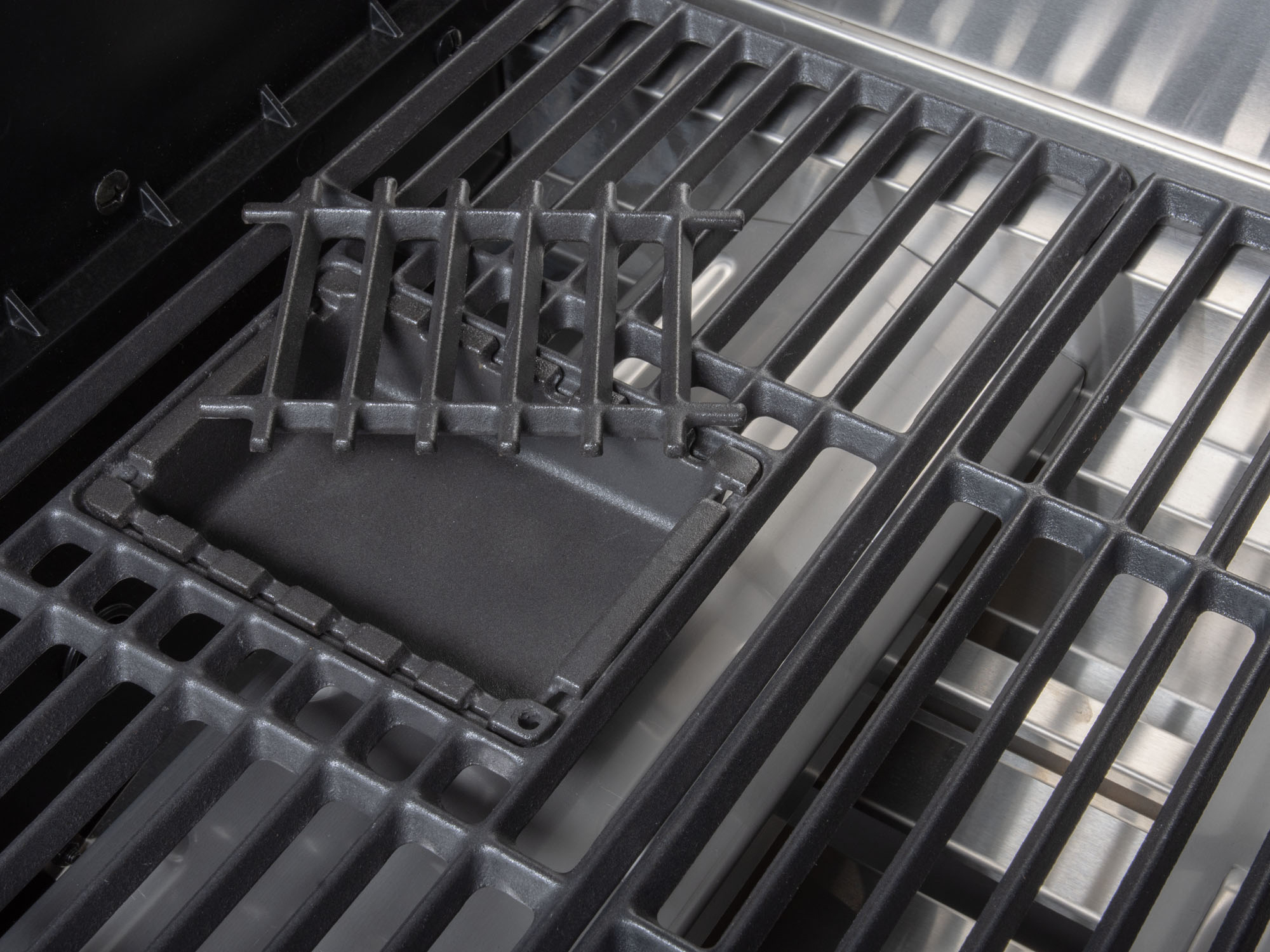 • Dank der gusseisernen Grillroste mit integrierter Smokerbox können Sie bequem mit Holzchips räuchern