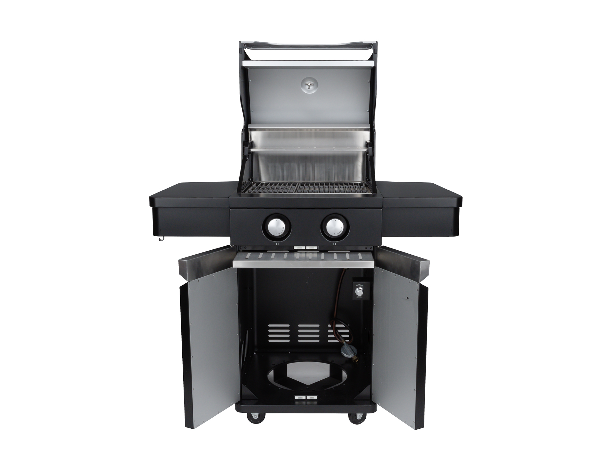 Unter dem Grill befindet sich ein Schrank mit Doppeltür, in dem Sie die Gasflasche und Zubehör ordentlich verstauen können. Über dem Grillrost sitzen ein Warmhalterost und eine hochwertige Warmhalteplatte aus Edelstahl – praktisch, um bereits Gegrilltes warmzuhalten, während Sie den Rest fertig grillen. So liegt nicht alles gleichzeitig auf dem Rost und Sie behalten leichter den Überblick.