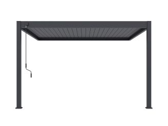 Eine dunkle Aluminium Pergola mit heruntergelassenem Windschutz vor einem Gartenteich
