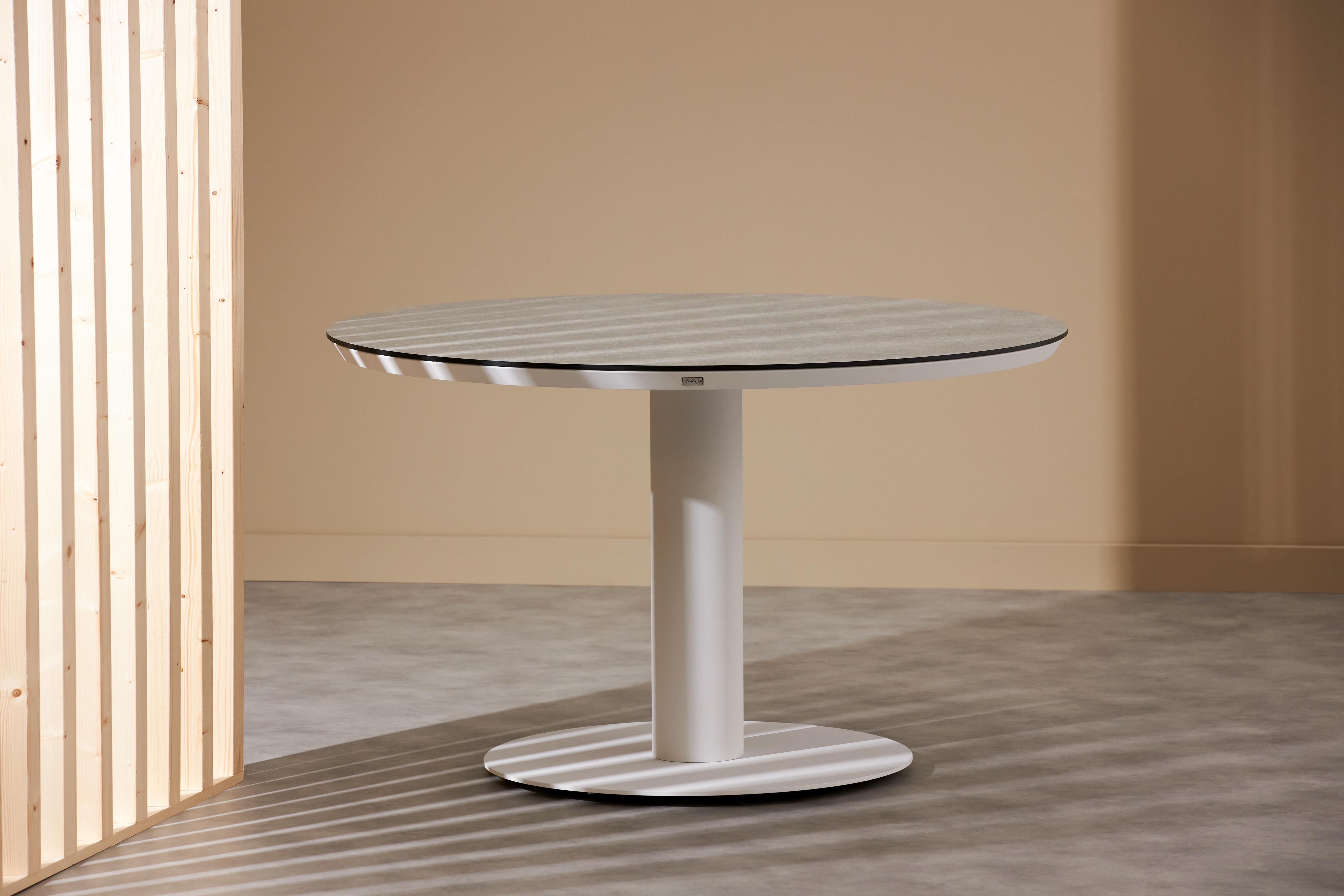 Robuster Tisch: Der runde Tisch aus HPL Travertin ist kratz- und fleckenresistent, was ihn besonders pflegeleicht macht. Mit einem Durchmesser von 120 cm bietet er ausreichend Platz für vier Personen.