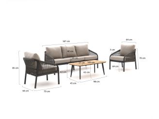 Das Manifesto Copparo Sessel-Sofa Lounge-Set ist ein kompaktes Set für 5 Personen – ideal, wenn Sie entspannt loungen, aber auch gemütlich am Tisch sitzen möchten. Der Aluminiumrahmen ist leicht, sodass Sie Sofa und Tisch mühelos versetzen können, wenn Sie Ihre Terrasse neu anordnen oder reinigen möchten. Die Kissen haben abnehmbare Bezüge mit Reißverschluss, sodass Sie sie im Handumdrehen abnehmen und reinigen können. Dank der Sessel-Sofa Aufstellung passen Sie die Anordnung ganz einfach an Ihre Vorlieben an: ein Sofa mit einzelnen Sesseln oder alle etwas näher beieinander. So wird aus der Plauderecke im Handumdrehen ein gemütlicher Platz für lange Sommerabende.