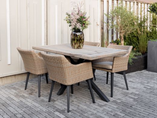 Das Manifesto Matese/Montorio Gartenmöbel-Set ist eine robuste und stilvolle Wahl für Ihren Außenbereich. Mit Platz für vier Personen bietet es die perfekte Gelegenheit, um gemütliche Abende im Freien zu verbringen. Der Tisch aus Old Teak Greywash ist nicht nur ein Hingucker, sondern auch wetterfest und langlebig. Die Stühle aus handgeflochtenem Polyrattan sind bequem und kommen mit weichen Sandkissen, die für zusätzlichen Komfort sorgen. Dank des stabilen Aluminiumrahmens müssen Sie sich keine Sorgen um Rost oder Wackeln machen.