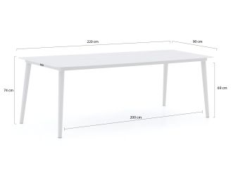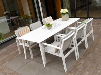 Der Manifesto Sora Gartentisch bietet Platz für bis zu sechs Personen und ist die ideale Wahl für gesellige Abende im Freien. Mit seiner robusten Aluminiumkonstruktion in elegantem Weiß und Ecru ist er nicht nur ein Hingucker, sondern auch besonders widerstandsfähig gegen Witterungseinflüsse. Der rechteckige Tisch ist 220 cm lang und 90 cm breit, was ausreichend Platz für ein gemütliches Essen mit Freunden oder Familie bietet. Dank der stabilen Bauweise steht der Tisch fest und sicher, selbst bei lebhaften Runden. Ein praktisches Möbelstück, das Ihnen viele Jahre Freude bereiten wird.
