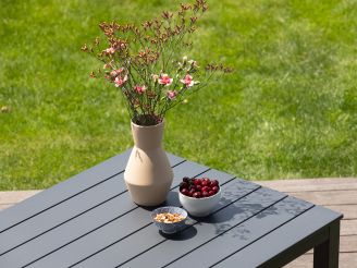 Das Manifesto Villongo/Menzano Gartenmöbel-Set ist ein kompaktes Set für 4 Personen – ideal, wenn Sie eine kleinere Terrasse oder einen Balkon haben, aber trotzdem gern draußen essen. Die Kombination aus einem Aluminiumtisch mit Aluminiumstühlen und Sitzflächen aus grauem Polyrattan macht das Set leicht, stabil und pflegeleicht. Die Stühle sind stapelbar – wenn Sie das Set einmal nicht nutzen, schaffen Sie im Handumdrehen wieder Platz. Durch das klare Design und die dunkle Farbe wirkt das Set ruhig, ohne dass die ganze Terrasse gleich vollgestellt ist.