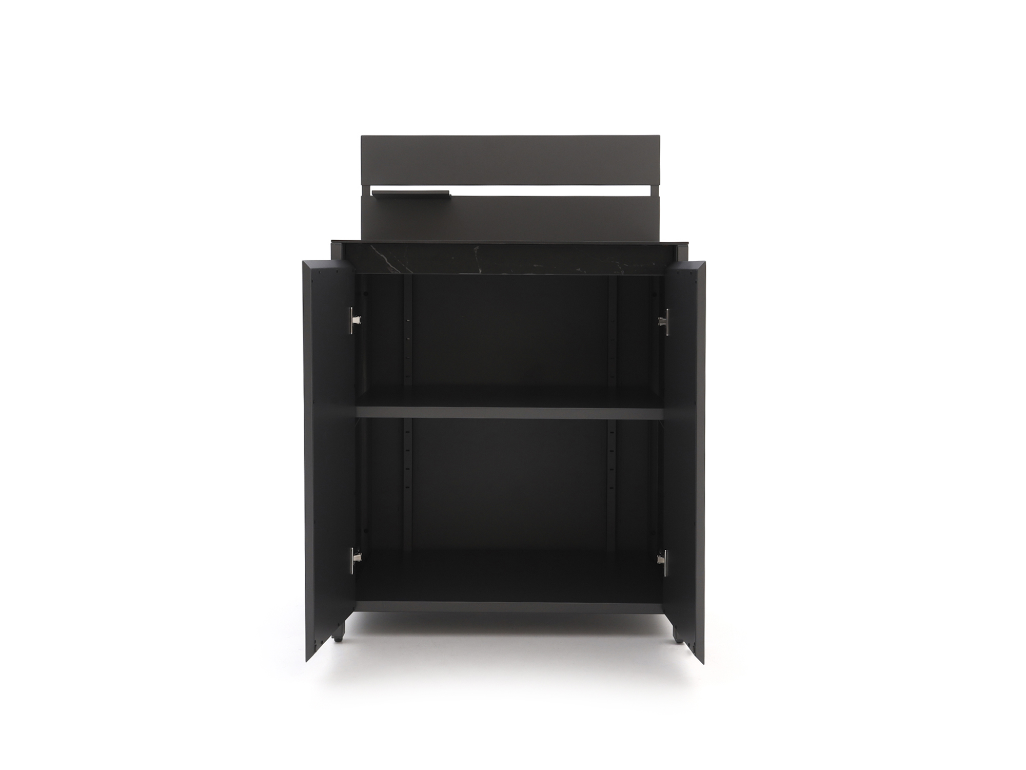 Hinter den Türen verbirgt sich Stauraum mit verstellbaren Einlegeböden. So können Sie das Innere ganz nach Ihren Wünschen einrichten: von Kohle und Holzchunks bis hin zu Schalen, Gewürzen und Zubehör. Die verstellbaren Böden helfen Ihnen, alles stabil abzustellen, ohne Wackeln. Zusätzlich wird ein kleiner Zusatzboden mitgeliefert, den Sie flexibel in die Rückwand einhängen können – praktisch für kleinere Utensilien, die Sie beim Grillen schnell zur Hand haben möchten.