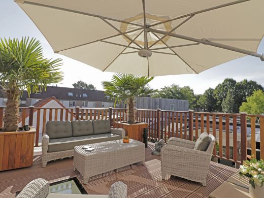 Ein heller Ampelschirm über einem Ecklounge-Set mit hellgrauen Kissen