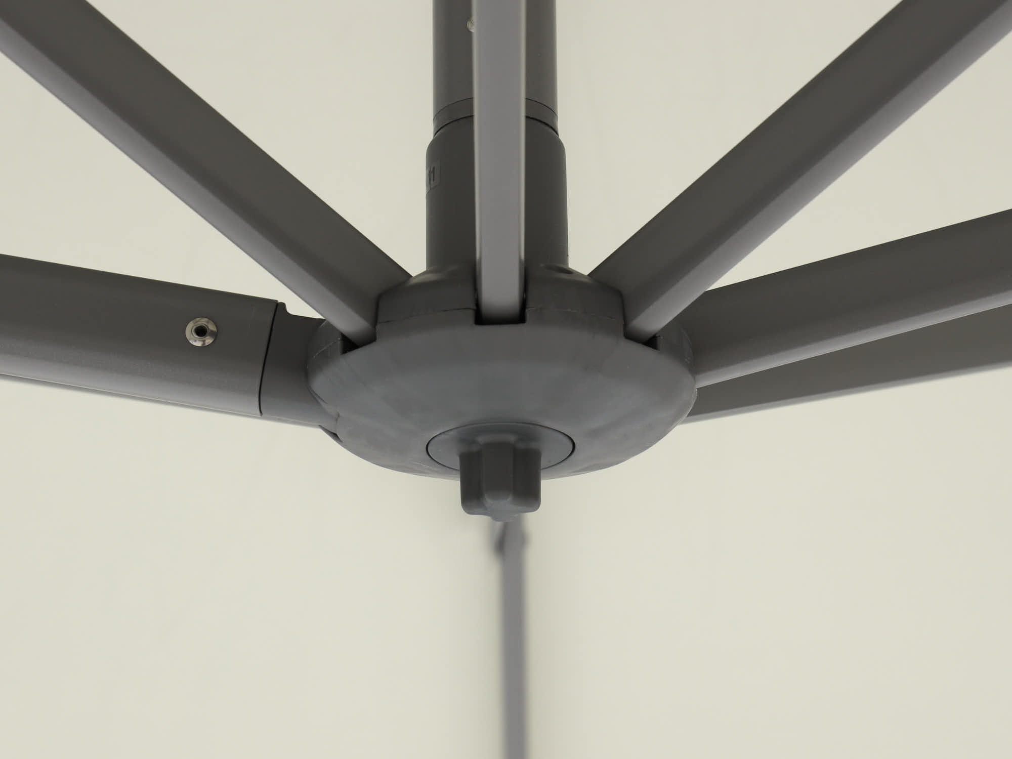 Ein heller Ampelschirm über einem Ecklounge-Set mit hellgrauen Kissen