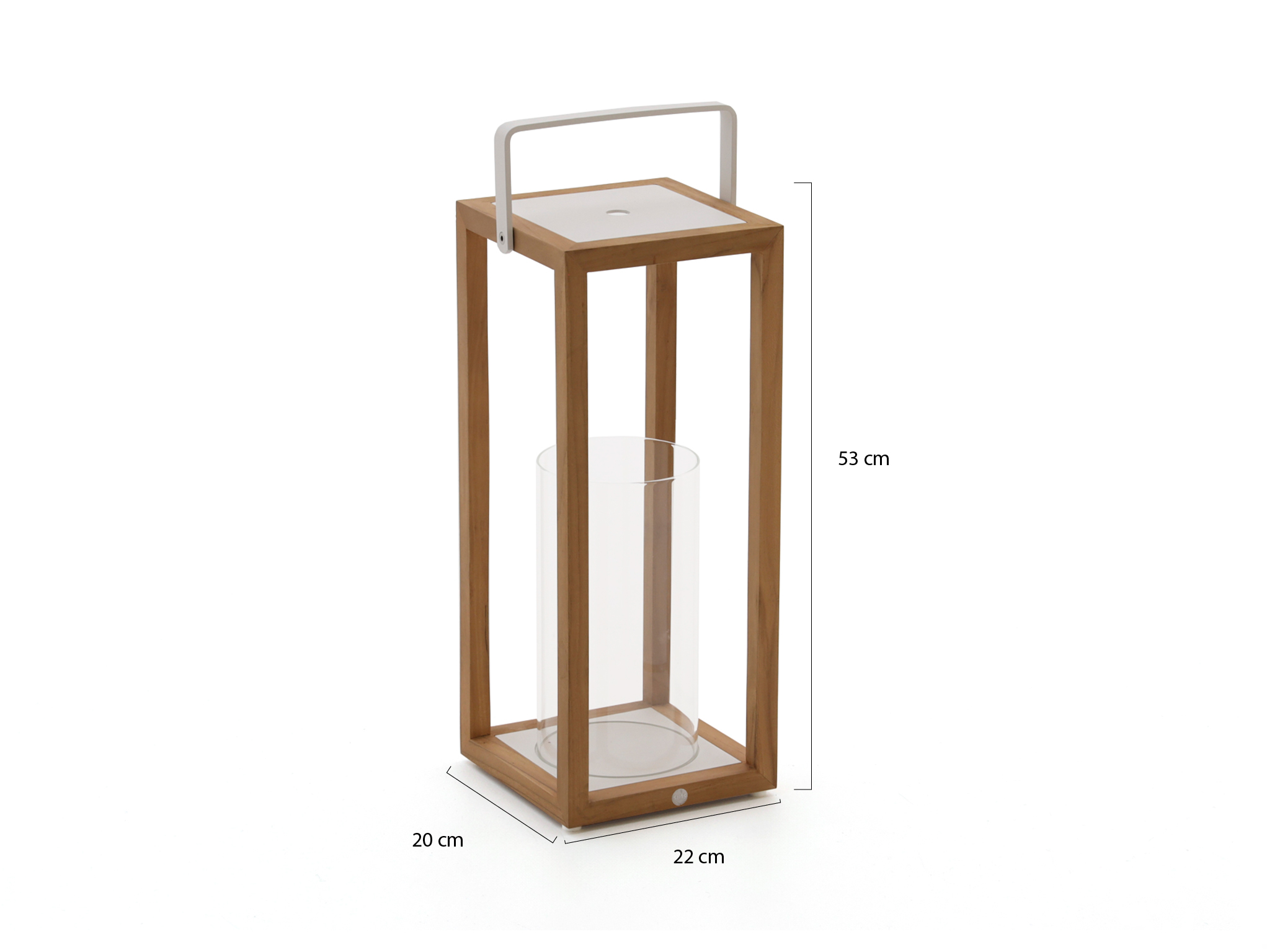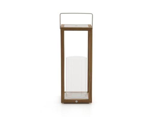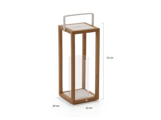 Die SUNS Sam Laterne stellen Sie im Handumdrehen auf den Gartentisch, neben das Lounge-Set oder an die Haustür – für direktes Stimmungslicht. Der Aluminiumrahmen mit Natural Teak und mattweißer Optik passt mühelos in viele Gärten und Wohnstile. Sie verwenden sie mit einer LED-Kerze oder einer separaten Beleuchtung Ihrer Wahl. Es ist keine Lichtquelle enthalten – so wählen Sie selbst, was Sie einsetzen. Dank des Griffs nehmen Sie sie schnell mit – vom Balkon in den Garten und wieder nach drinnen. Für drinnen und draußen geeignet. Das Format 20x22x53 cm ist praktisch: hoch genug, um aufzufallen, kompakt genug für den Tisch.