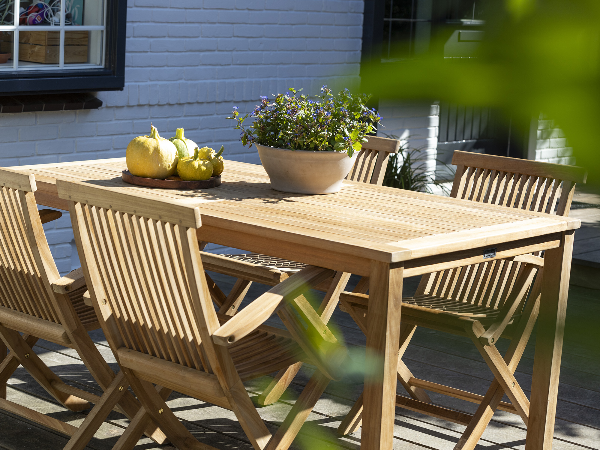 Wetterbeständig: Teakholz ist von Natur aus widerstandsfähig gegen Regen und Sonne, sodass das Set das ganze Jahr über draußen bleiben kann.